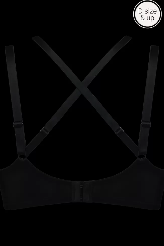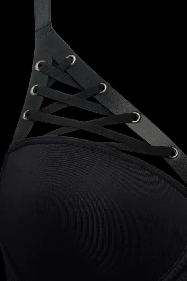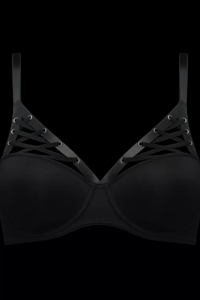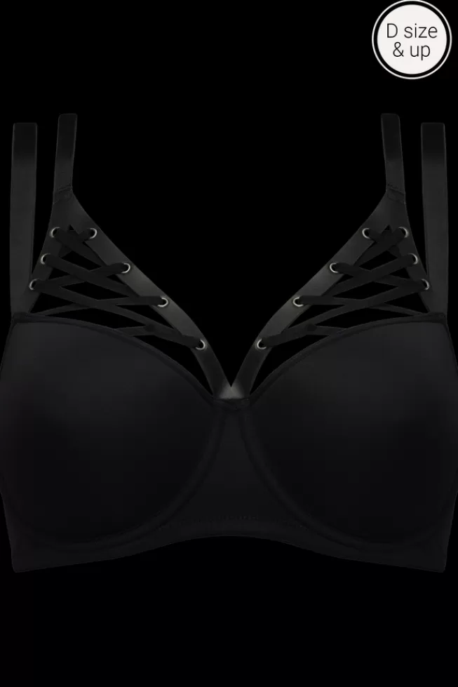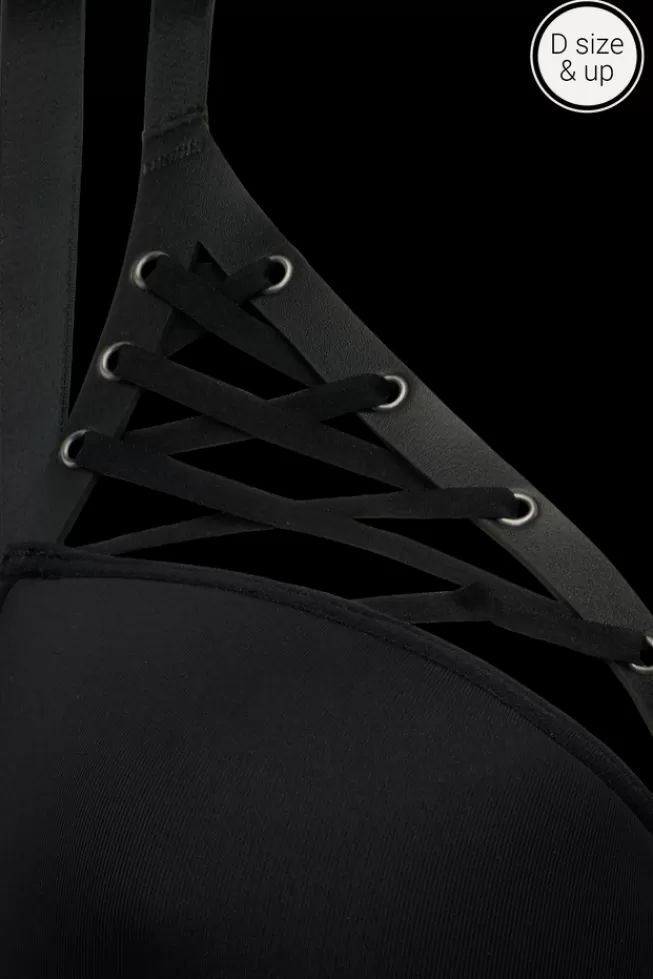 Deze uitdagende plunge balconette beha biedt een comfortabele pasvorm en biedt voldoende ondersteuning. De beha creëert een subtiele maar sensuele decolleté. Hij is gemaakt van diepzwart gerecycled microvezelstof. Elastische vetersluitdetails trekken de aandacht naar je rondingen op de perfecte plaatsen. De vetersluiting wordt op zijn plaats gehouden door imitatieleerriempjes voor een stoer accent. Voor cupmaten D, E en F zijn de vetersluitdetails verbonden met sensuele bandjes die elkaar kruisen op de rug.
