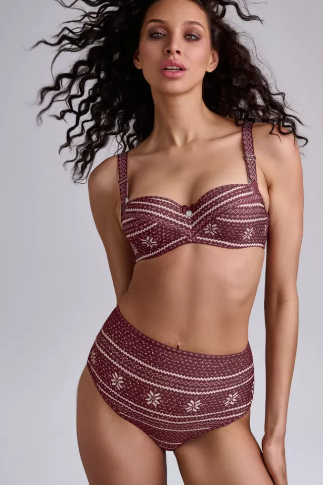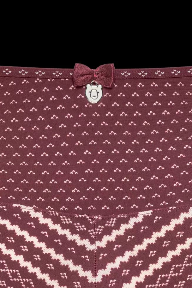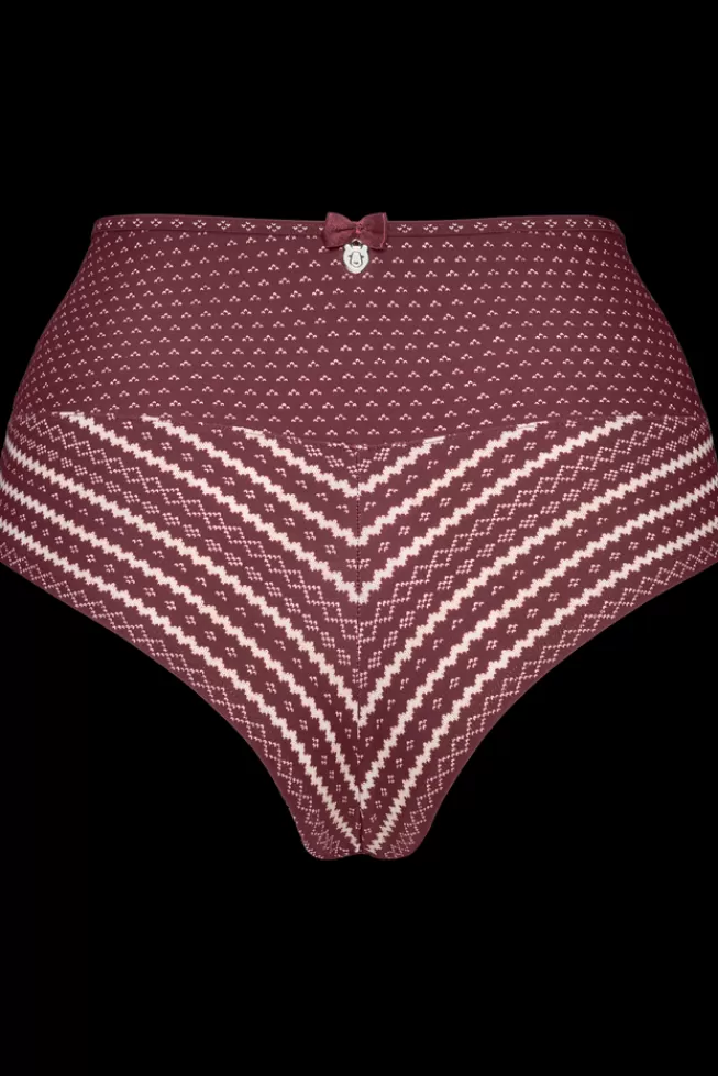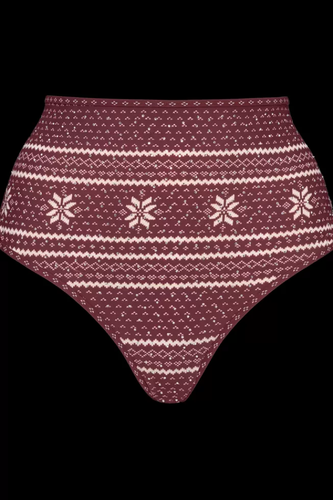 Deze high waist slips accentueren je rondingen door comfortabele bedekking te bieden voor je onderbuik en heupen. Het bovenste gedeelte van je billen is bedekt terwijl het onderste gedeelte bloot blijft. Deze slips zijn gemaakt van gerecyclede stof in cabernet red met een digitale print die eruitziet als breiwerk. Digitaal printen is een duurzamere manier van printen die 50-60 liter water per meter stof bespaart. De glinsterende strass-steentjes, als ijskristallen over het hele ontwerp, zijn de perfecte finishing touch.