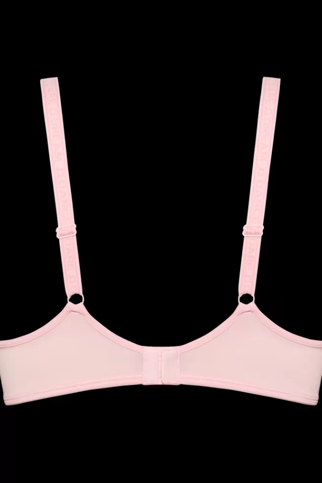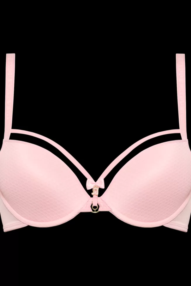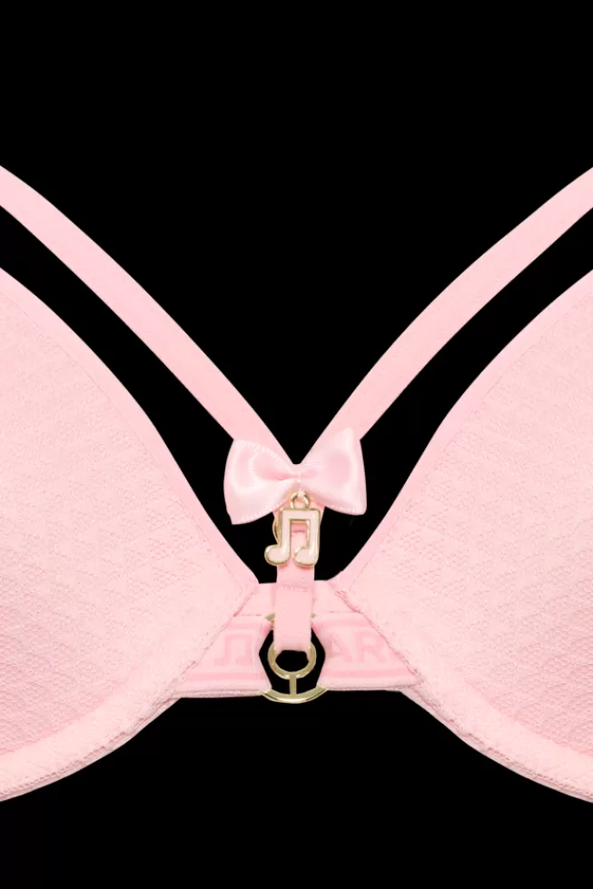 Deze lichtroze push up bh zorgt voor een sexy, diep decolleté met zachte kussentjes aan de binnenkant van de cups. Sensuele bandjes verfraaien je decolleté. De banden zijn verbonden door een zilverkleurig, op een ruimteschip geïnspireerd ornament. De bh is gemaakt van een transparante mesh-stof met een geweven patroon van kleine driehoekjes. Een strikje met muzieknoothanger in bijpassend roze maakt het ontwerp compleet.