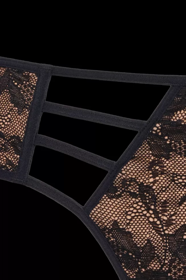 Ontketen je innerlijke godin met deze verleidelijke zwarte brazilian slip. Het grootste deel van de heup en lies wordt prachtig bedekt met delicaat, licht transparant kant, terwijl je buik en het onderste deel van je billen verleidelijk worden blootgelaten. Intricate ontworpen met speelse straps, uitdagende cut-outs, en een luxe combinatie van zwart gerecycled kant en nude-kleurige voering, is dit stuk een prachtige toevoeging aan je lingerie collectie. Combineer deze betoverende slip met een bijpassende beha uit de collectie, en omarm je sensualiteit met vertrouwen.